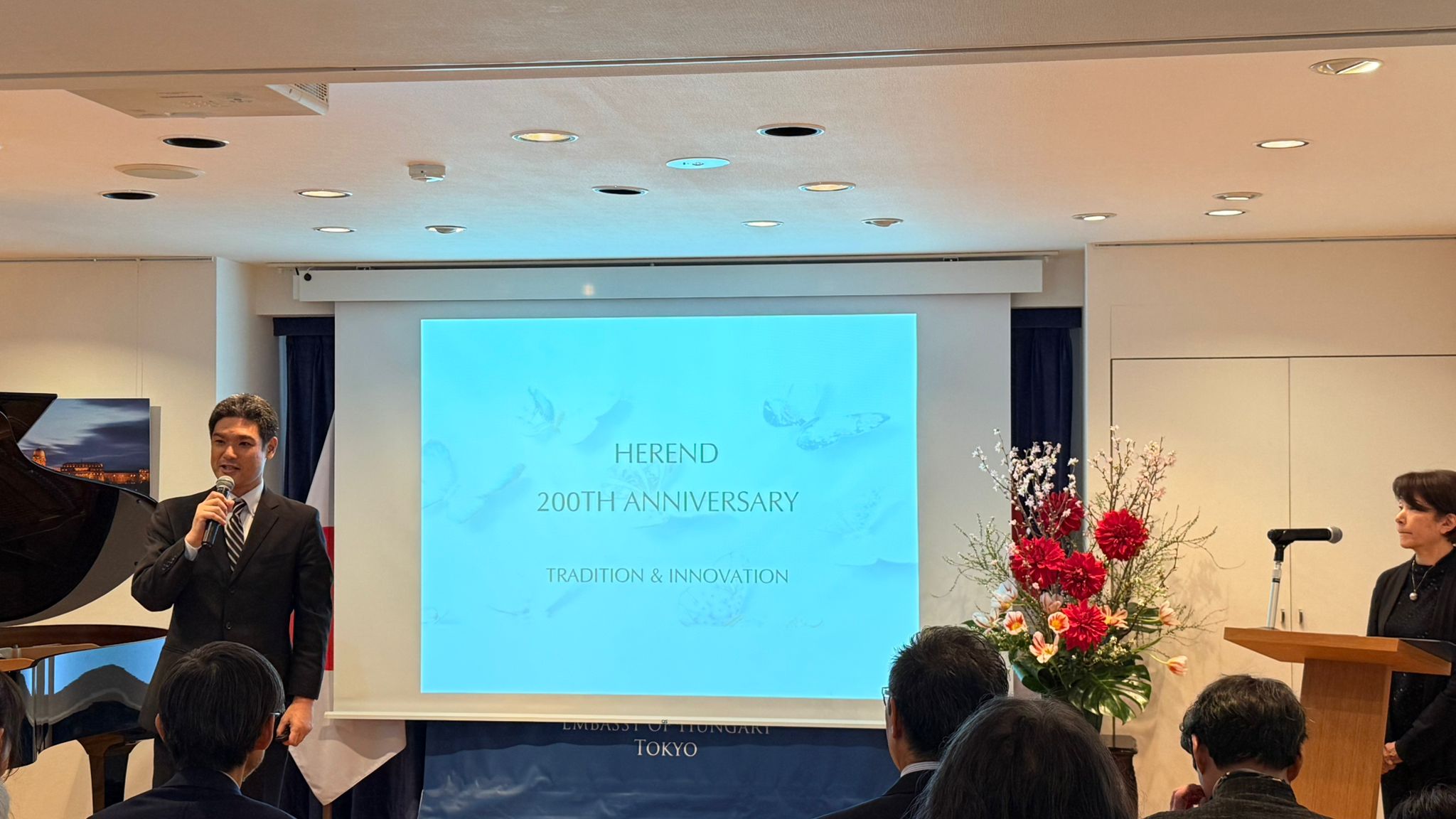 A Herendi Porcelánmanufaktúra Zrt. fennállásának 200. évfordulója alkalmából rendezett Herendi porcelán kiállítást SZUZUKI Daiszuke, a Hoshi Shoji Részvénytársaság vezérigazgatója, valamint dr. Kovács Emese, a nagykövetség ideiglenes ügyvivője nyitotta meg.